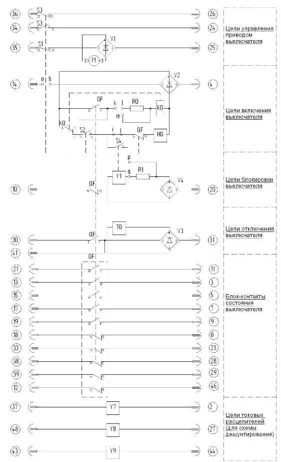 - Положение элементов на схеме соответствуют состоянию выключатель "Отключен" и привод не взведен.