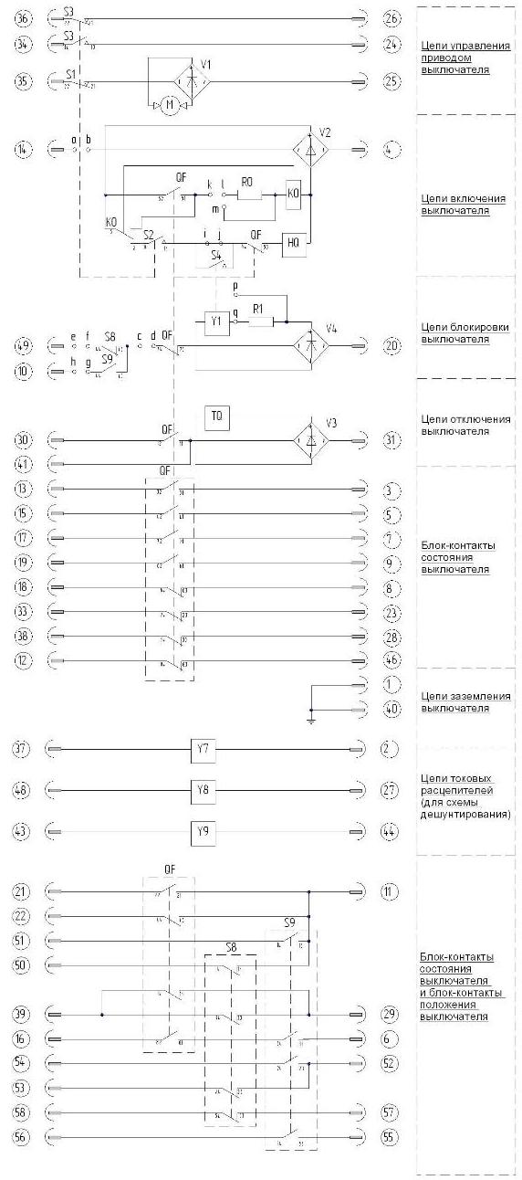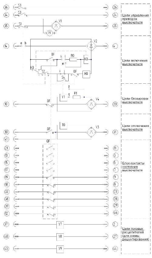 - Положение элементов на схеме соответствуют состоянию выключатель "Отключен" и привод не взведен.